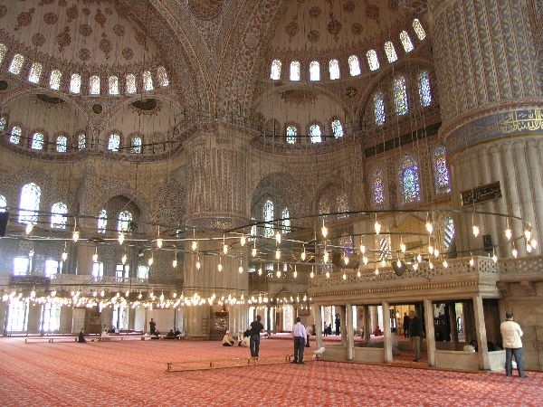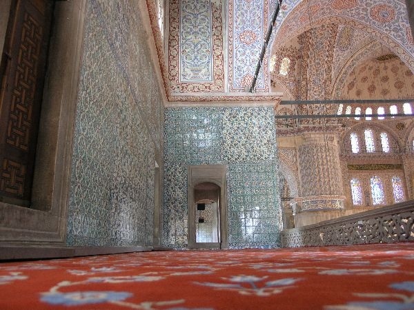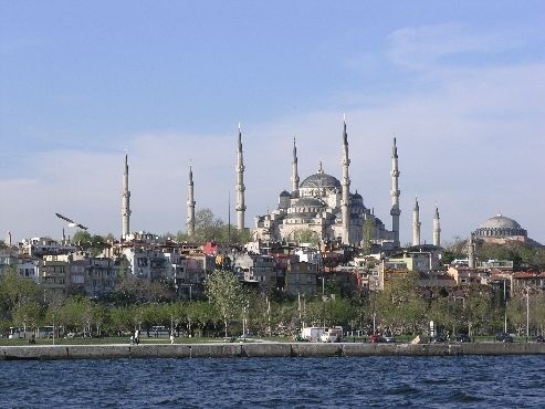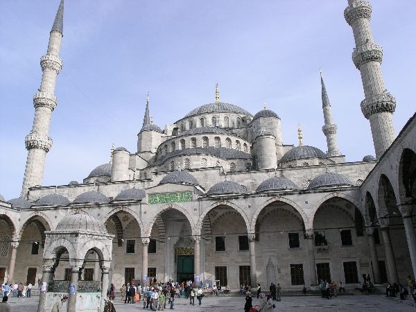19. dubna 2008 - přes most Galata jsme zamířili do kopece k věži GALATA. Výtahem jsem vyjeli na vyhlídkovou plošinu se skvělými pohledy na celý Istanbul. Po té jsem taxikem přejeli most, který spojuje evropský a asijský kontinent a nechali se dovést k MODRÉ mešitě /Sultan Ahmet Camii/. Byla stavěna v letech 1609-1619. I když je vyzdobena 20 000 modrými kachli nepůsobí zvlášť modře. Zvenku je pozoruhodná svými 6 útlými minarety, ze kterých se 5x denně ozývá zpěv koránu.