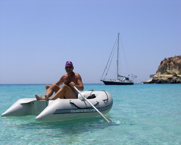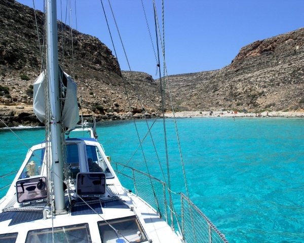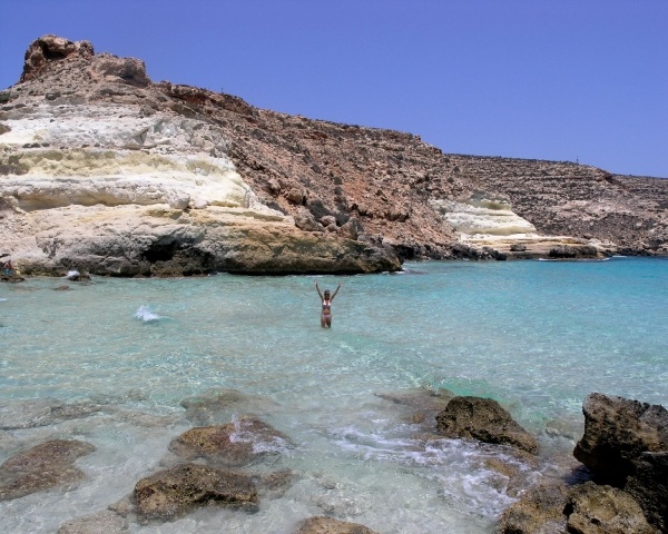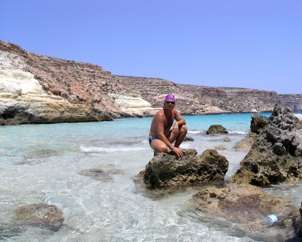 Modrou lagunu jsme opustili ve 4 hod. ráno a vypluli na LAMPEDUSU. Celých 90 n.m. ani nefouklo, takže jsme to celé odmotorovali. Plavbu nám zpříjemnila fotomodelka želvička. Lampedusa je malý italský ostrov na cestě do Afriky. Má jedno hlavní středisko, kde žije okolo 6 tis. obyvatel. Ostrov je vyprahlý. Jižní pobřeží má několik lagun s průzračnou vodou a jsou vyhlášeny přírodní rezervací. Bohužel co se týče života pod vodou, kterou ostrov nabízí, jsme nepotkali ani delfína.