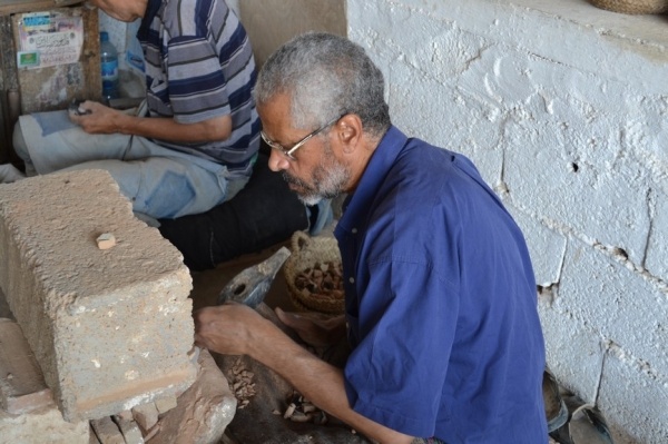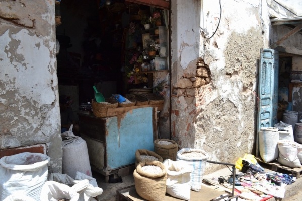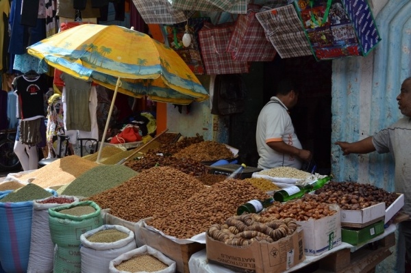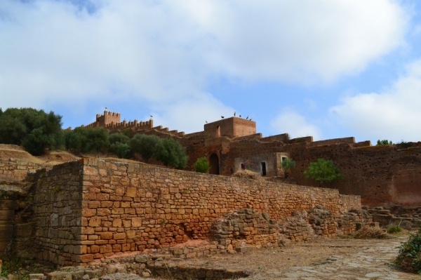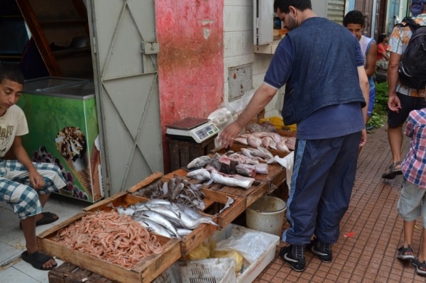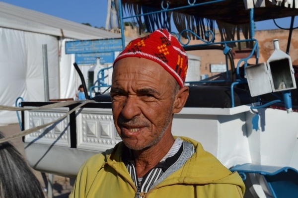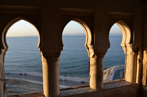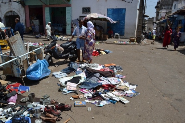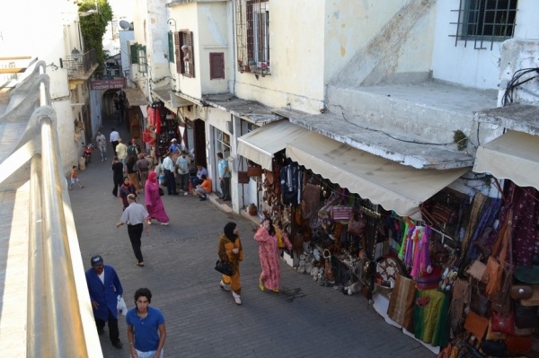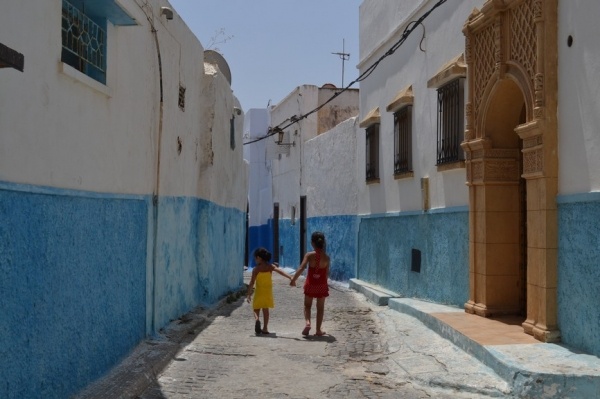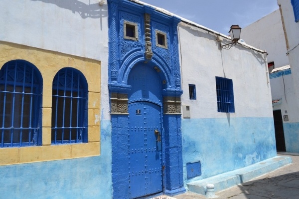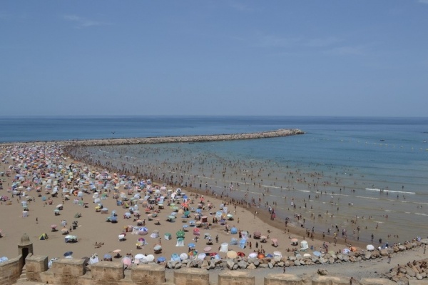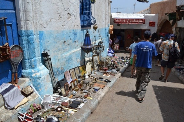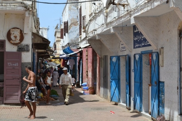 Měli jsme problém s focením. Místní si to nepřejí. Raději jsme súk opustili a vydali se do Kasby, která je dnes obytná. Bílo-modré domky připomínají andalúzskou architekturu. Z terasy je výhled na oceán a na pláž obleženou místními obyvateli. Turistů je tady hodně málo.