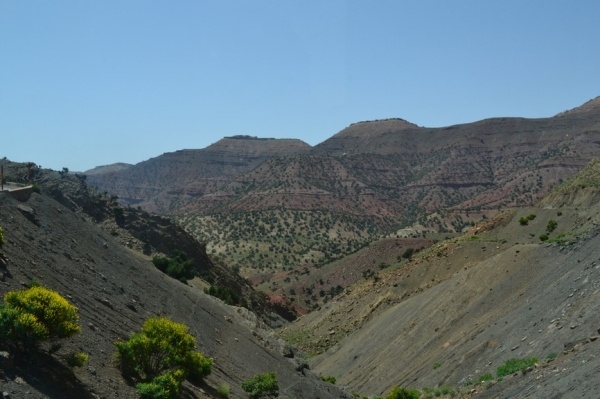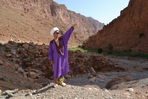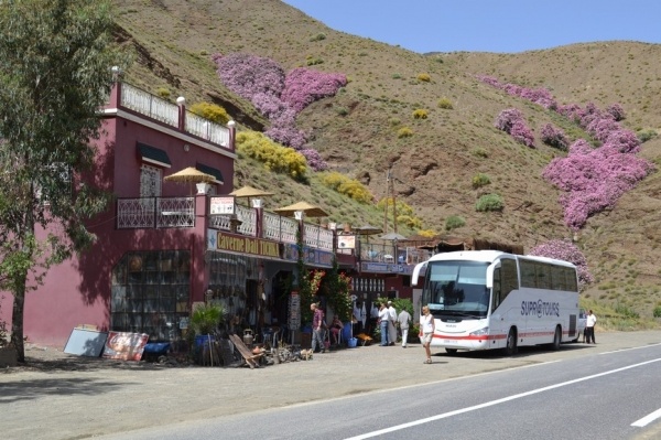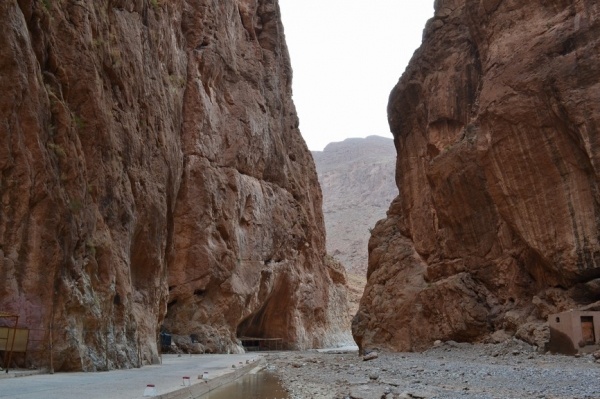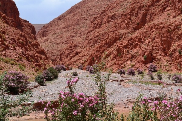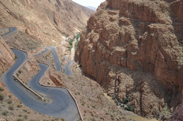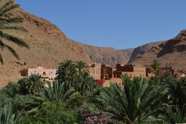 Další den jsem pokračovali dále na východ soutěskou DADES. Jeli jsme nádhernou krajinou, kterou lemovalo červené pohoří a kvetly rododendrony. Vesničky s růžovými hliněnými domy se se střídaly s palmovými oázami. Asi 15 km od města Tínerhídu v místě pukliny Vysokého Atlasu je nejkrásnější soutěska v Maroku-TODRA. V soutězce vyvěrá řeka v nejužším bodě jsou skály vysoké 300 m. Je tu moc příjemné klima a tak jsme kousek odtud strávili noc v hotelu s bazénem.