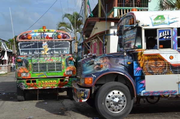 Místní autobusy jsou malá umělecká díla. My se jedním vydáváme na návštěvu Colónu. Řidič jede jako s formulí a jsme rádi, že bez nehody vysedáme v centru města. Zde je velká tržnice plná všech produktů. Mimo hlavní třídu jsou však celé bloky domů těsně před spadnutím a jsme důsledně upozorňováni na bezpečnost. Colón je statisticky na 10. místě na světě ve zločinosti. Raději se tedy uklidíme do známé Free Zony, kde se prodává hlavně elektronika a oblečení bez daně.