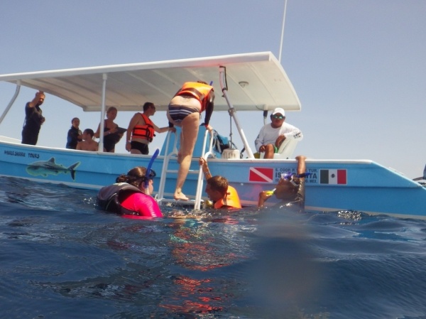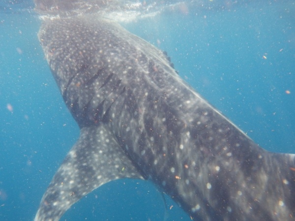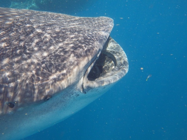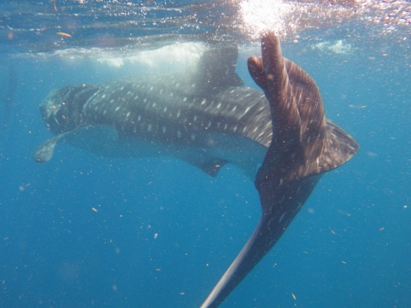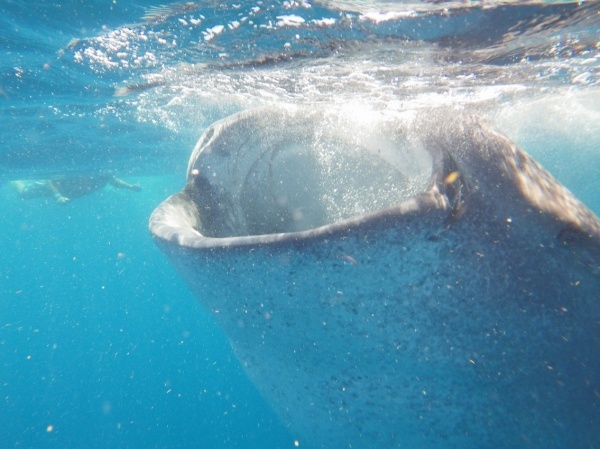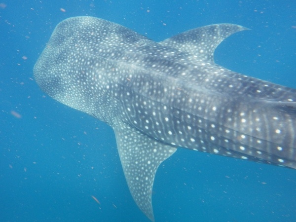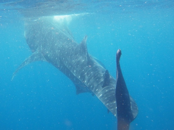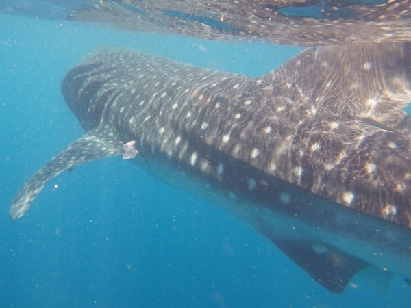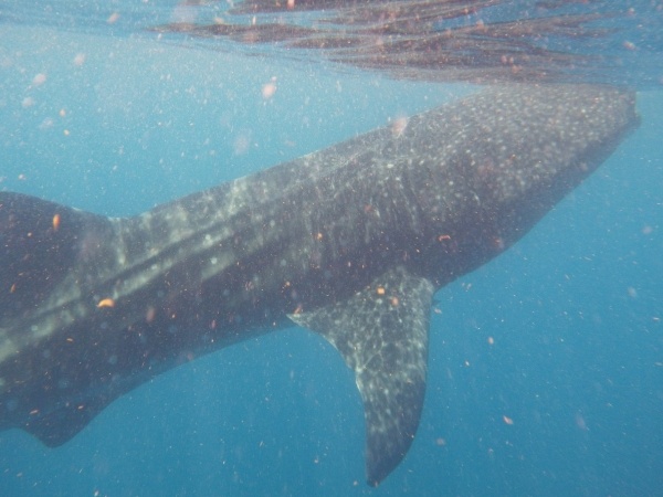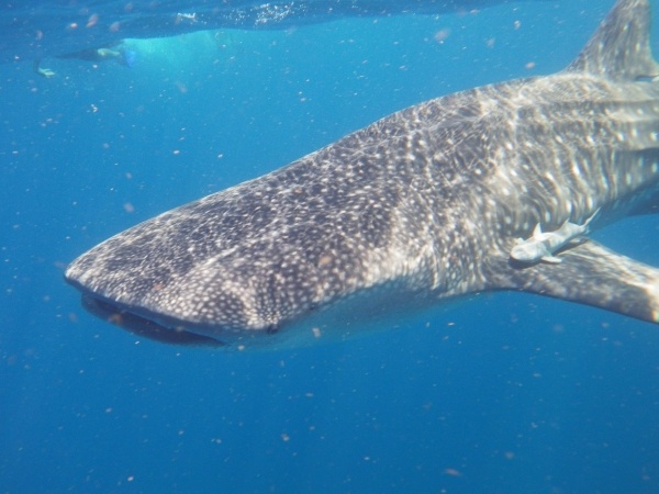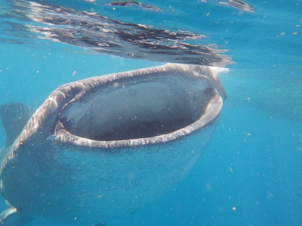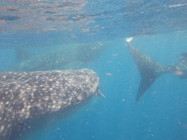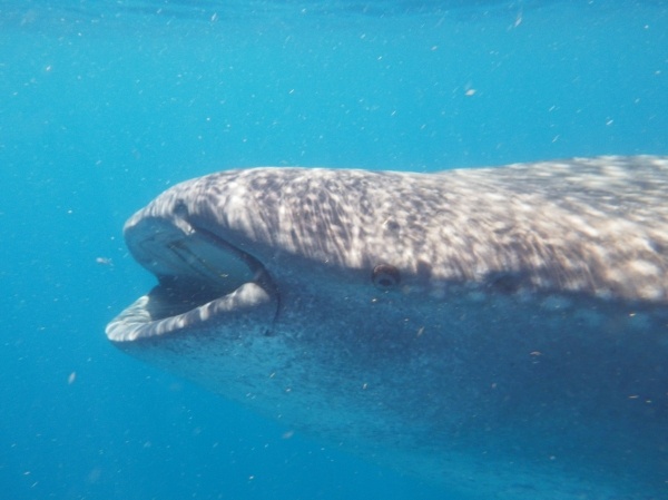 Velrybí žralok je největším ale také neškodným žralokem. U pobřeží Mexika se vyskytují v letním období, kdy sem připlouvají až z Austrálie. Na útesovém zlomu si hodují na planktonu a koncem září se opět vrací. Konečně se mi tedy podaří vidět tyto krásné tvory z bezprostřední blízkosti a doslova se na nich povozit. Bylo jich zde asi 15 kusů a největší měli kolem 10 metrů.
