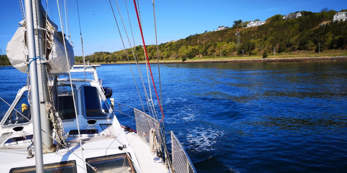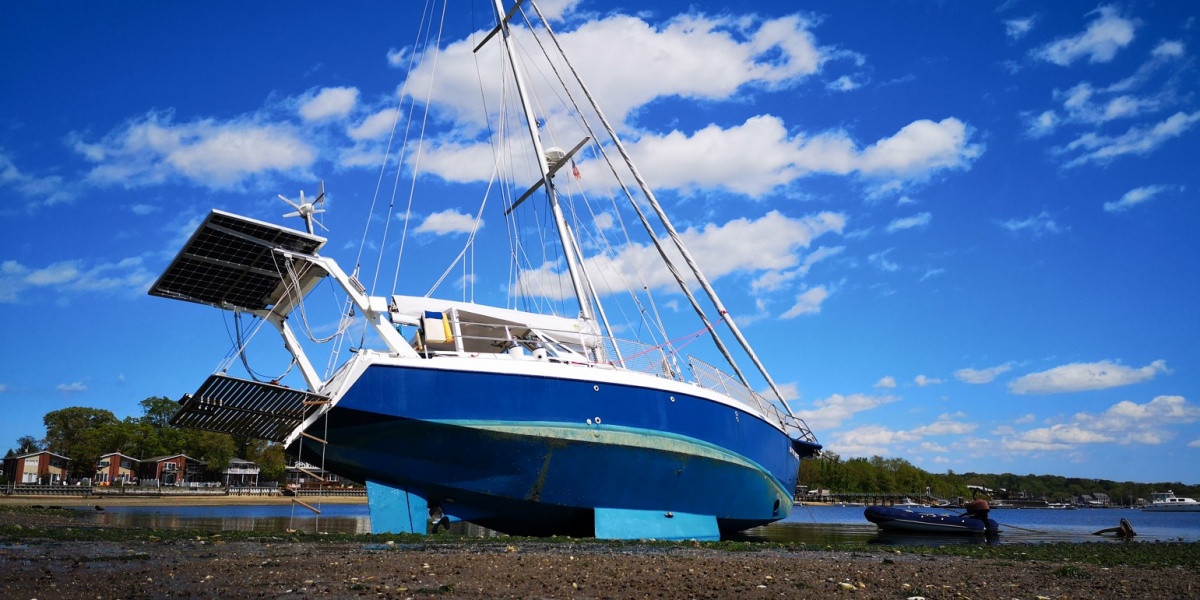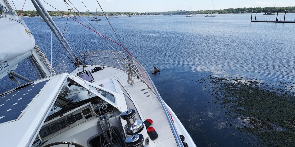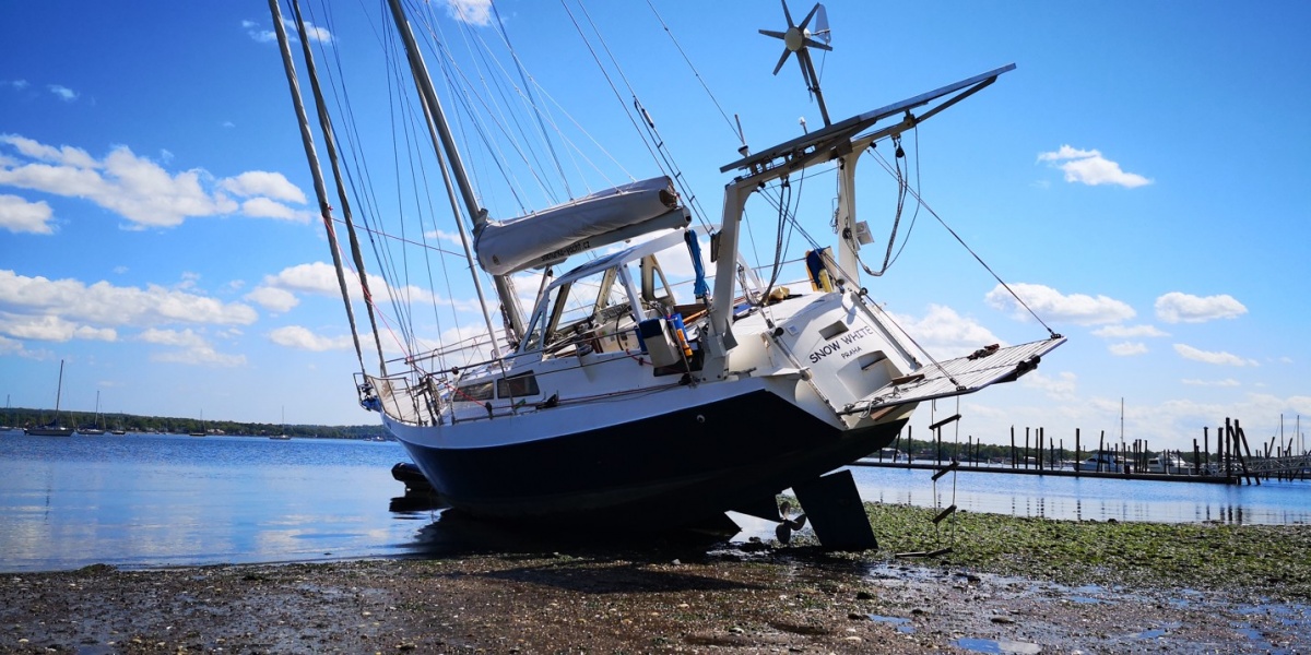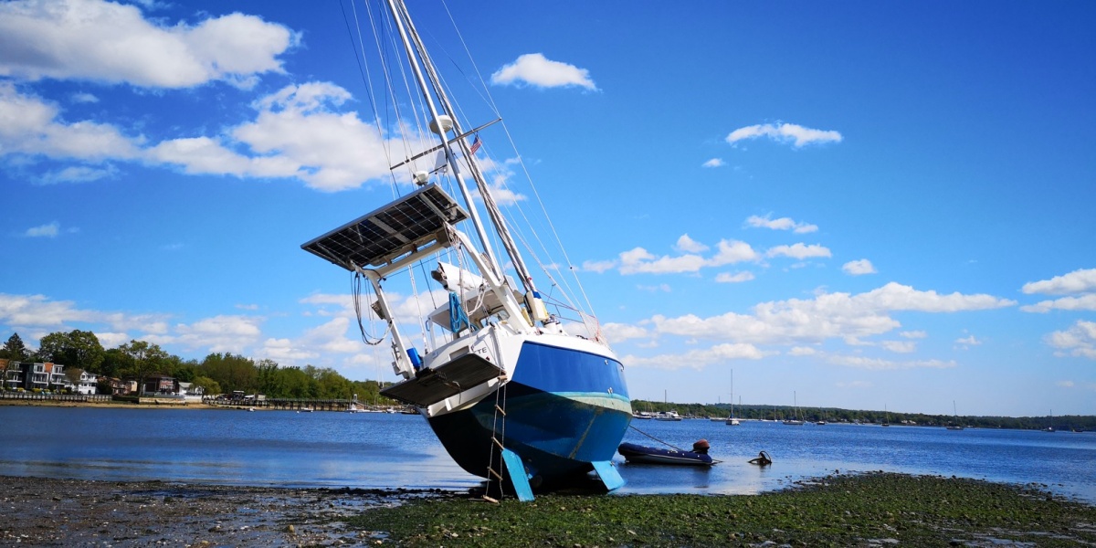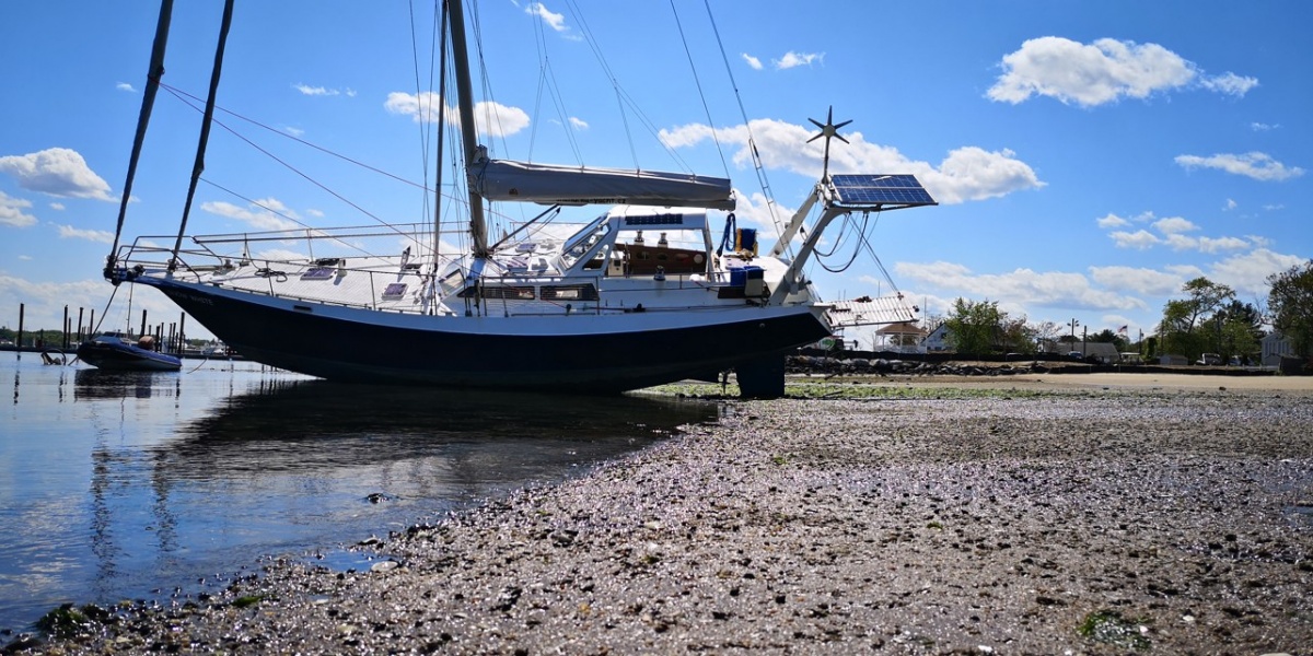 Mým prvním úkolem je vyměnit těsnění hřídele, na což potřebuji být na suchu. Nechci platit drahý jeřáb v marině, takže využiji místního vysokého odlivu. Najedu k pláži a počkám na odliv. Sněhurka si sedne na dno a po opadnutí vody provedu opravu. Plán je to perfektní až do doby, než se začal levý kýl mačkat do měkého bahna a Sněhurka se začala hrozivě naklánět. Přiznám se, že jsem byl na infarkt. Ale jako vždy to nějak dopadlo, Sněhurka si sedla levou stranou až na dno, čímž se zastavilo naklánění. Při přílivu se opět narovnala a mohl jsem odplout s opraveným těsněním zpět na mooring.