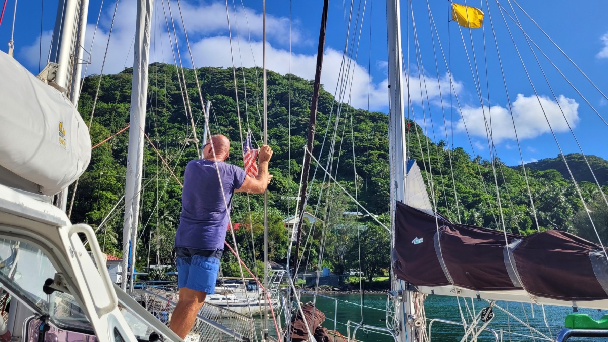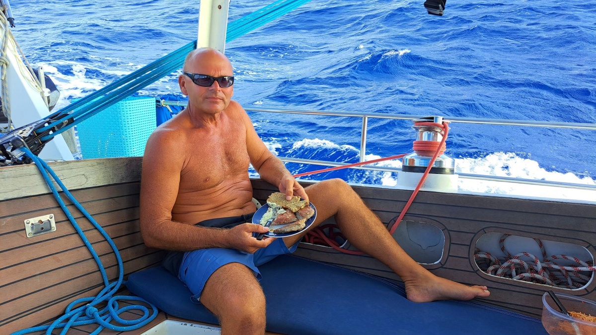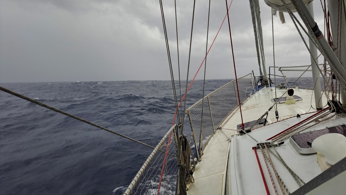 Dalších 460 mil před přídí a míříme stále na západ. Pravidelně nás dohánějí černé dešťové mraky se změnou větru. Jenže po 2 dnech přijde přímo do přídě opravdu silná bouře. Stálý vítr 35 kn s poryvy přes 40 kn. Vlny se zvedají na 4 metry a s motorem se pomalu držím na kurzu. Po 3 hodinách vítr slábne a mohu v klidu pokračovat dál.